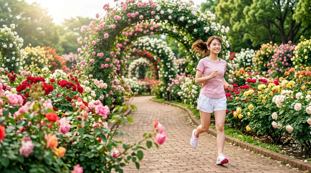 バラの見ごろとなる春(4月下旬〜6月上旬)に走れば、ランニング途中に薔薇の轍のバラ鑑賞という贅沢な体験もでき、汗を流したあとの花めぐりは特別な達成感を生んでくれます。