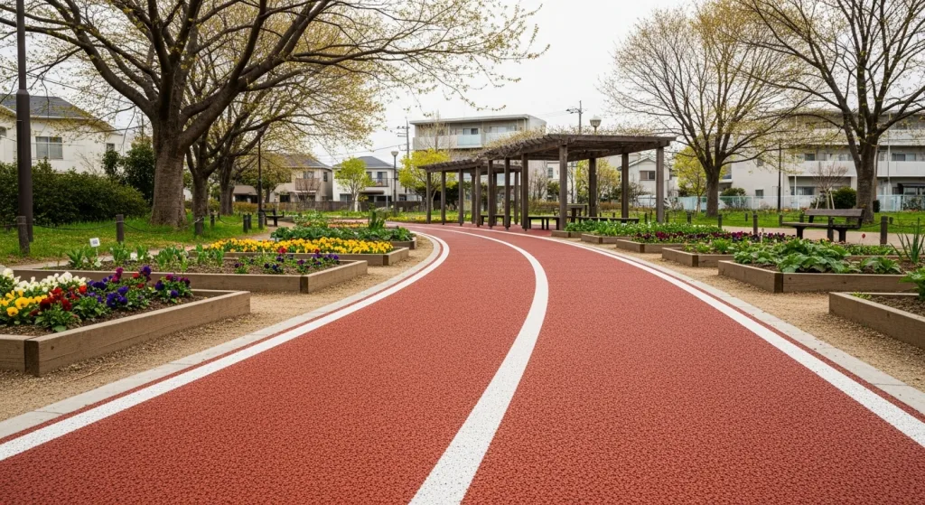 川崎市富士見公園北側ジョギングコースの魅力!ゴムチップ舗装と100m距離表示で快適ラン